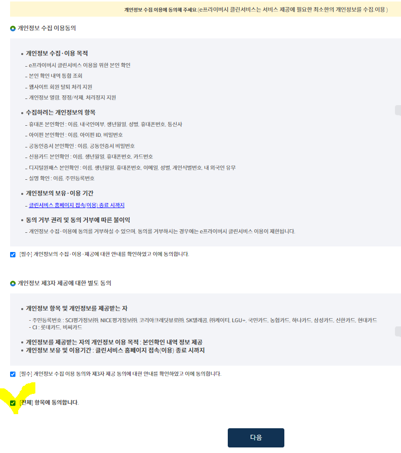 가장 먼저 할 일은 개인정보 수집/이용에 대해 동의해주시는 것이 필요한데요. 전체 항목에 동의합니다. 에 체크하시고 다음을 눌러주세요.