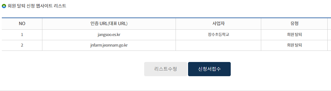 조회된 회원 탈퇴 신청 가능 화면에서 대상 리스트를 확인하면서 불필요한 사이트들을 체크하여 선택해줍니다.