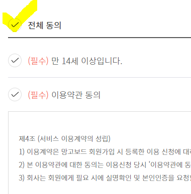 이용약관에 대해서는 전체동의에 체크한 후 선택사항은 제외하셔도 됩니다. 하단에 등록하기를 눌러 계속 진행하시기 바랍니다.
