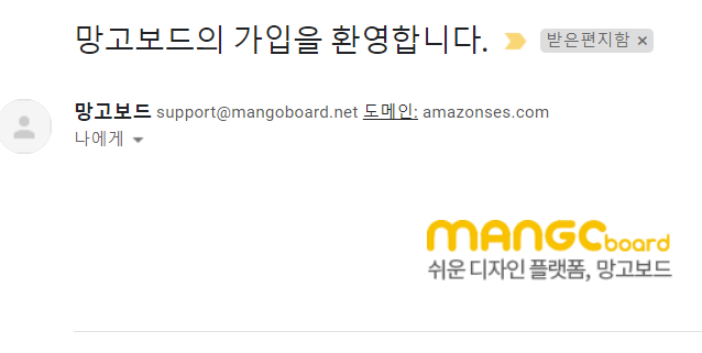 망고보드 회원가입시 일반 회원가입은 이메일 인증을 진행하는 듯 한데, 저는 sns 계정으로 회원가입을 진행했더니 이메일 인증은 하지 않았으며 단, 이메일 수신함에 망고보드 가입 환영 이메일은 수신하였습니다.