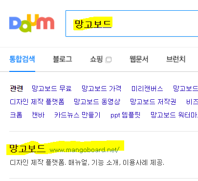 망고모드로 다음이나 구글 검색으로 홈페이지를 찾아 접속합니다. 다음에서 망고보드는 디자인 제작 플랫폼으로 소개되어 있습니다.