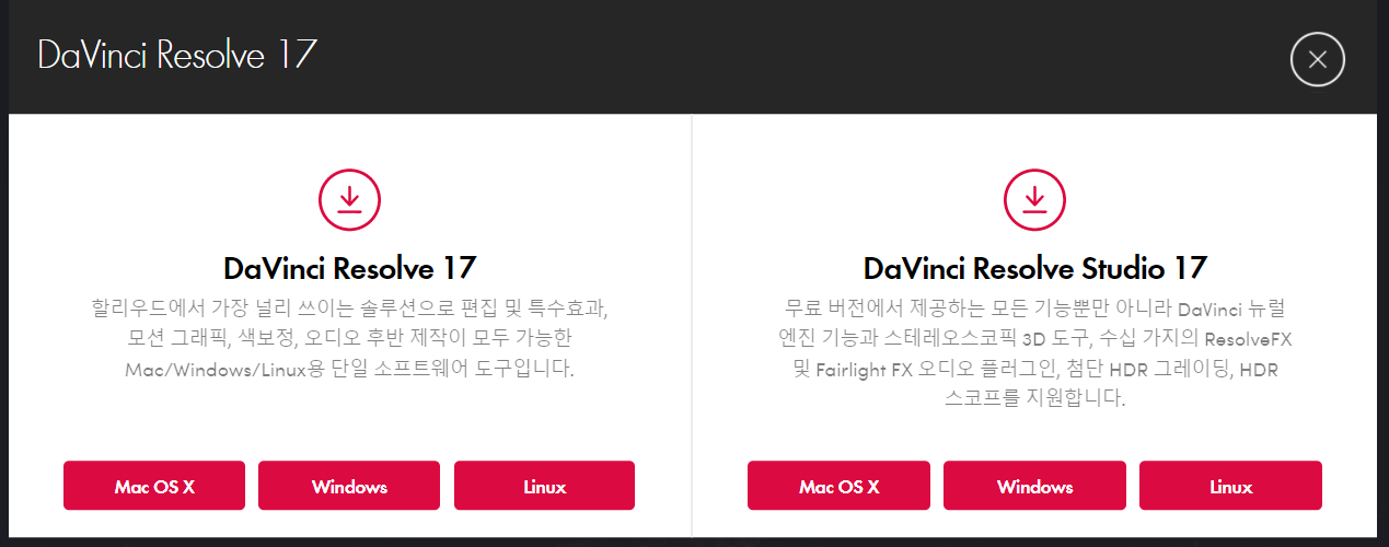 무료 다운로드하기 아이콘을 클릭하면 다음과 같은 다운로드 화면이 팝업(Pop-up) 화면으로 나타납니다. 저희는 다빈치 리졸브 DaVinci Reslove 17을 다운로드하겠습니다. 사용하고 있는 PC의 OS의 종류에 맞게 Mac, Windows, Linux로 구분하여 다운로드하시면 됩니다.