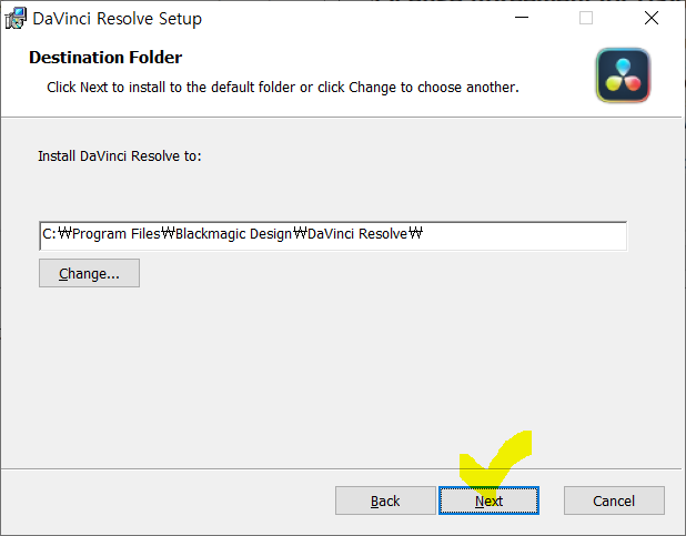 - Destination folder : C:\Program Files\Blackmagic Design\DaVinci Resolve\