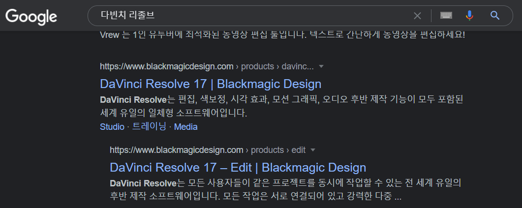 구글에서 다빈치 리졸브로 검색하면 블랙매직디자인(blackmagicdesign.com)의 Davinci Resolve를 찾으실 수 있는데요. 검색 결과 상단에 노출되지 않기 때문에 아래로 내려가시면서 찾으셔야 합니다.
