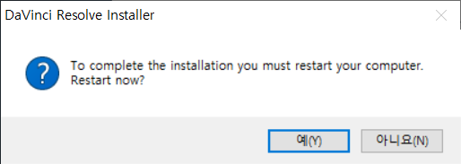 Davinci Resolve Installer 팝업 화면에서 인스톨을 완료하려면 컴퓨터를 리스타트해야 한다고 하네요. 이런 경우 꼭 한 번은 컴퓨터의 리스타트가 필요하니 가능한 바로 PC를 리스타트한 다음 확인해보시면 좋습니다.