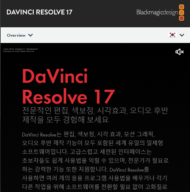 링크 url을 클릭해서 들어가면 다음과 같이 블랙매직디자인의 다빈치 리졸브 영상편집 소프트웨어에 대한 홍보 영상이 바로 플레이됩니다. 잠시 감상하시는 것도 재미있습니다.