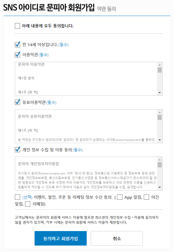 SNS 아이디로 문피아 회원가입 시에 약관 동의하는 화면에서 아래 내용에 모두 동의합니다를 체크한 후 선택사항의 경우 마케팅과 관련한 항목이기 때문에 정보를 수신할지 개인적인 판단이 필요합니다.