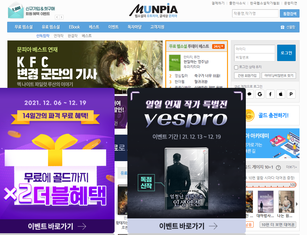 문피아 홈페이지 주소를 클릭하니 첫 화면인 메인화면의 구성을 확인할 수 있는데요. 이벤트 팝업창들이 여러 개 떠있고 무료 웹소설, 유료 웹소설부터 EBook, 베스트 등 상단의 주요 메뉴들이 눈에 들어옵니다.