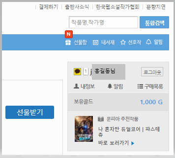 문피아 웹소설 감상 플랫폼에 SNS를 이용해서 간편 회원가입을 할 수 있었는데요. 로그인 후 보이는 선물함, 내서재 등을 클릭해서 최초 웹소설 감상 전에 확인해보도록 하겠습니다.