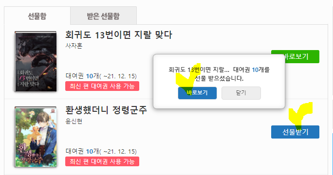 문피아 선물함의 좌측 본문 내용에는 선물함과 받은 선물함으로 탭(Tap)이 나눠져 있는데요. 선물함에서 추천하고 있는 웹소설 작품들에 대해서 '선물 받기'를 이용해서 대여권을 받아 최신 편에 대한 대여권 사용을 이용한 감상이 가능합니다.