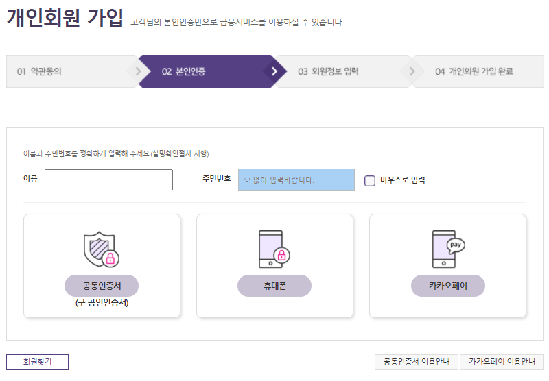 이름과 주민번호를 입력해서 실명확인 절차를 진행합니다. 공동 인증서, 휴대폰, 카카오페이 등으로 인증이 가능합니다. 회원찾기 버튼이 있는데 이걸 누르고 주민번호를 입력하고 조회하면 회원가입 여부를 확인하실 수도 있어요.
