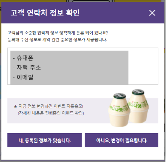 저의 경우 과거에 공동 인증서로 로그인했던 것으로 기억이 나서 공동 인증서(구 공인인증서)로 로그인을 시도해보겠습니다. 로그인이 정상적으로 되면서 고객 연락처 정보 확인 팝업(Pop-up)을 통해 휴대폰, 주소, 이메일 등을 확인하거나 변경할 수 있도록 안내하고 있습니다.