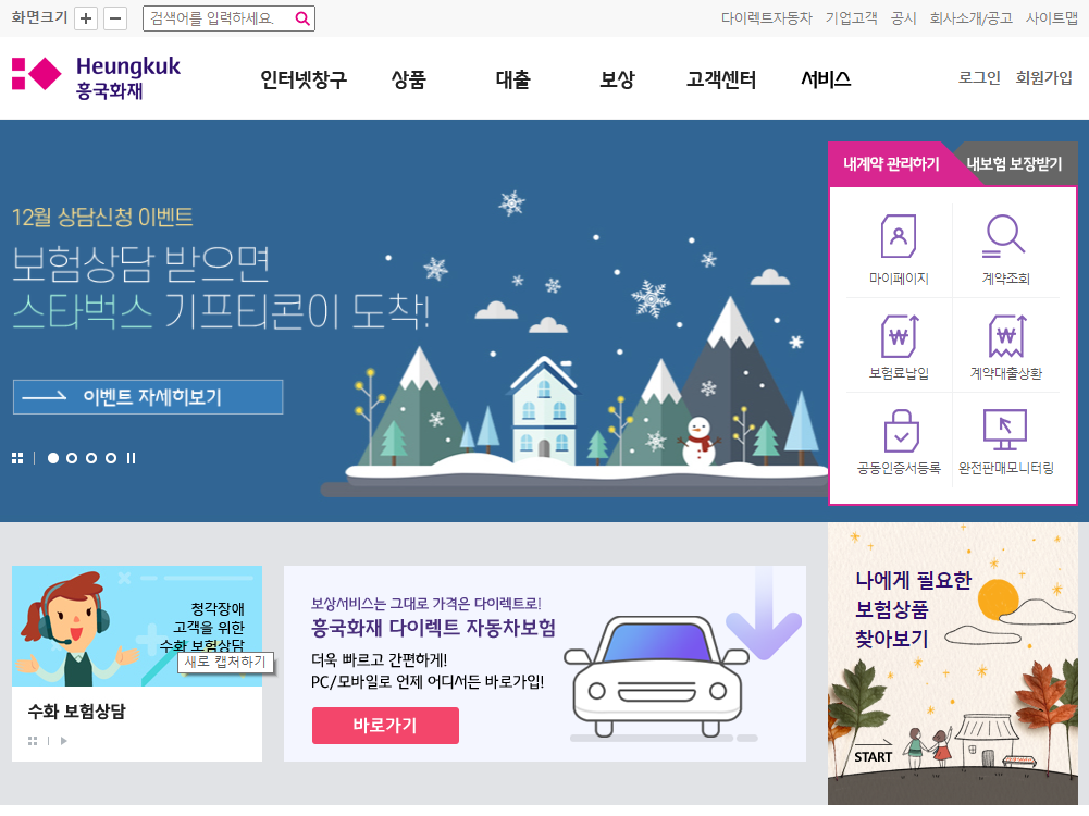 다음이나 구글에서 '흥국화재'로 검색해서 보험사인 흥국화재 대표 홈페이지를 찾아갑니다. 공식 홈페이지의 주소 url은 www.heungkukfire.co.kr입니다.