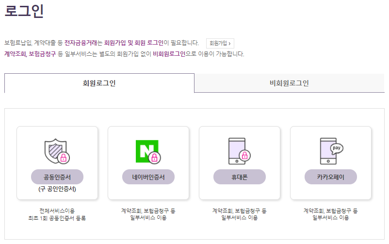 흥국화재 홈페이지 공동인증서 로그인과 카카오페이 로그인