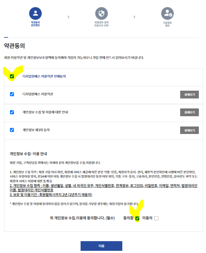 약관 동의 화면의 첫 번째 항목인 '전체 동의'를 체크하면 모두 체크가 됩니다. 개인정보 수집 동의까지 체크한 후 다음을 클릭하세요.