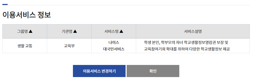 로그인 후 바로 보이는 것은 "나의 서비스"에서 제가 이용하고 있는 정부 서비스의 전체 현황이었습니다. 아직 나이스 대국민 서비스만 이용하는 것으로 나오는데 앞으로 디지털원패스를 이용해서 정부 서비스들을 하나하나씩 추가해나갈 생각입니다.