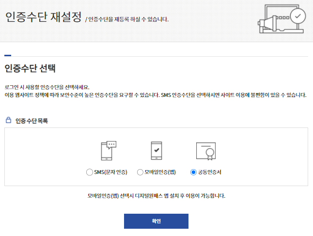 인증수단 선택 화면에서 수단 목록에 있는 SMS(문자인증), 모바일 인증(앱) 및 공동 인증서 3가지 중에서 다시 선택해서 어떤 것을 앞으로 인증수단으로 사용할지 결정하셔야 합니다. 저는 다시 공동 인증서를 선택해서 확인을 눌러보겠습니다.