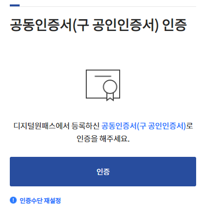 디지털원패스 회원가입을 하다 이미 회원가입이 된 것을 확인했고 로그인 시 기존에 등록한 인증수단인 공동 인증서가 변경되어 다시 등록해주는 과정을 거치게 되었습니다. 이제 로그인을 다시 해보니 정상 로그인이 완료되었습니다.