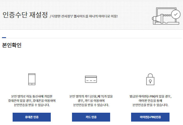 만약 이 과정에서 공동인증서 또한 그 사이에 변경되었다면 인증수단 재설정을 통해 공동 인증서를 변경할 수 있습니다. 본인확인 인증수단을 휴대폰 인증 등 하나를 선택한 다음 인증을 해주면 공동인증서를 추가, 변경할 수 있는 화면이 보이게 됩니다.