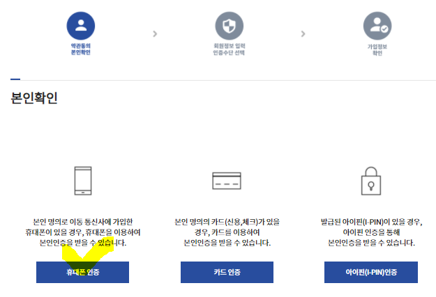 약관 동의에 이어 다음은 본인 확인이 필요합니다. 인증 방식은 휴대폰, 카드, 아이핀(I-PIN) 3가지 방식을 제공하고 있네요. 저는 휴대폰 인증으로 진행해보겠습니다.