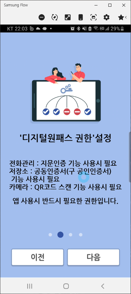 권한 설정 단계에서는 디지털원패스에서 전화 걸고 관리할 수 있도록 그리고 기기의 사진 및 미디어에 액세스할 수 있도록 '허용'을 클릭하는 과정으로 진행됩니다.