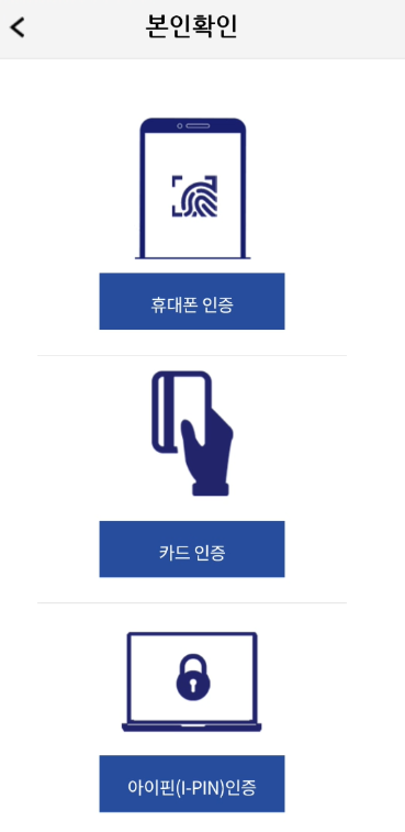 본인 확인 바로가기를 눌러 1) 휴대폰 인증, 2) 카드 인증, 3) 아이핀(I-PIN) 인증 중에서 하나를 선택합니다. 저는 가장 간단해 보이는 휴대폰 인증을 선택해 진행해보았습니다.