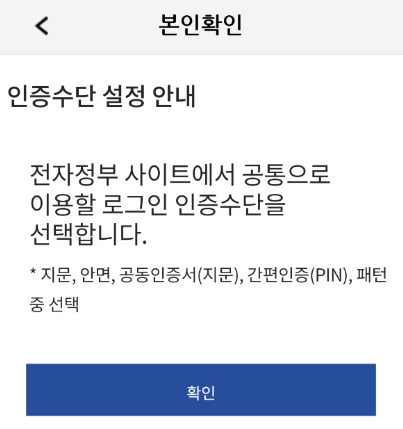 디지털원패스 앱 본인 확인 후 인증수단 설정 선택