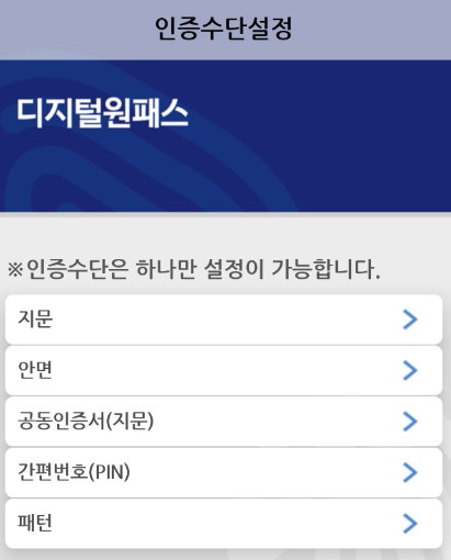디지털원패스의 인증수단은 지문, 간편 번호, 패턴 등 여러 인증 수단 중에서 단 하나만 설정이 가능하다고 하네요.