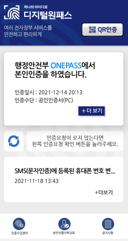 디지털원패스 앱의 인증수단을 등록한 후 첫 화면의 구성은 본인인증 내역의 확인, 인증 요청 확인 및 공지사항 내용과 함께 하단에 구성된 인증수단 관리, 본인인증 이력조회, 공지사항으로 바로 갈 수 있는 아이콘 등으로 구성되어 있습니다. 또한 화면 상단에 QR 인증을 통해 QR코드를 찍어 인증을 하는 기능도 제공됩니다.