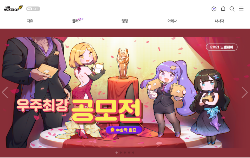 찾은 노벨피아 웹소설 홈페이지는 다음과 같습니다. 메인 화면은 커다란 홍보 페이지가 차지하고 있어 깔끔해 보이네요. 메인 메뉴인 자유, 플러스, 랭킹, 아레나 등 로그인을 하지 않고도 웹소설 콘텐츠를 개략적으로 살펴보실 수 있습니다.