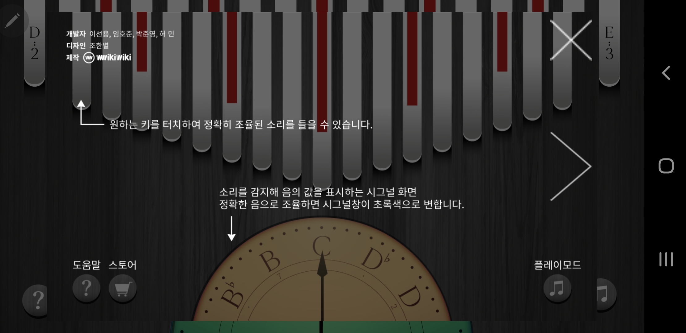 스마트 칼림바 플레이 모드에서는 금속으로 된 건반이 의미하는 키를 터치하면서 한음한음 소리를 들어보면서 칼림바의 한 키가 가지는 소리를 확인하실 수 있습니다.