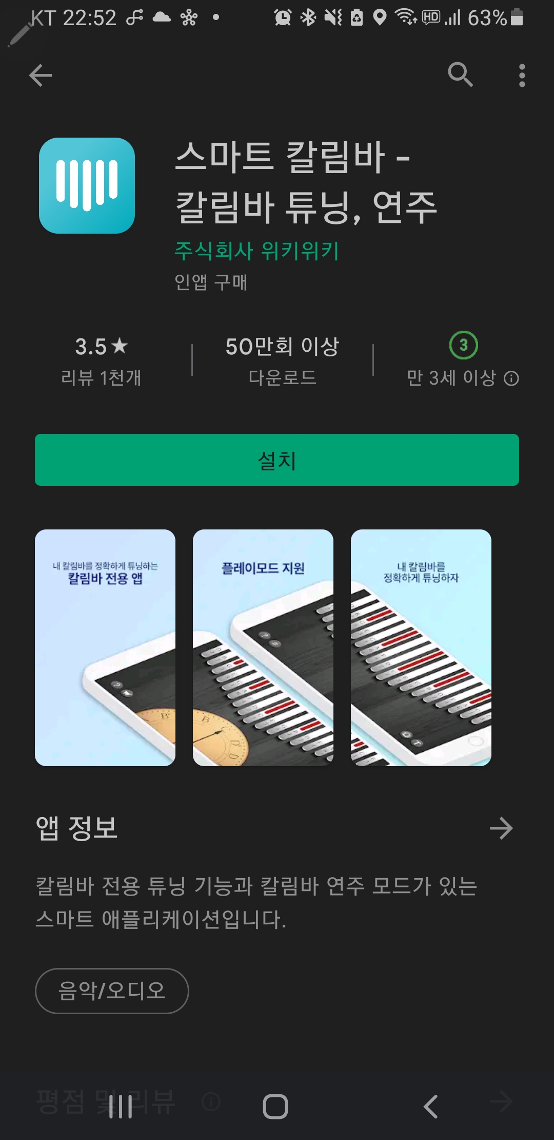 칼림바 튜닝, 연주 앱이라는 설명의 스마트 칼림바 앱을 배우기 위해 구글 플레이에서 설치해보겠습니다. '칼림바'로 검색하면 현재 가장 상단에 보이는데 다른 칼림바 앱들도 많이 있으니 확인하고 설치하시기 바랍니다.