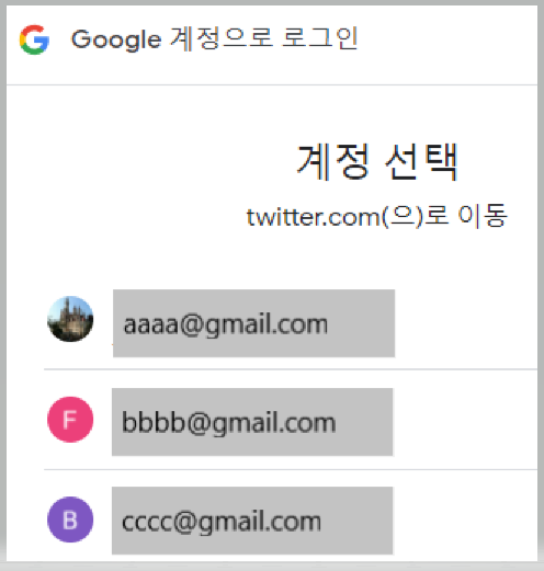 트위터 로그인 화면 상단에 구글 계정으로 가입하기라는 항목이 보이는데요. 이 부분을 눌러서 추가로 트위터에 가입하고자 하는 구글 계정을 하나 선택해주시면 됩니다.