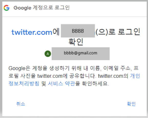 구글 계정 하나를 선택하면 선택한 구글계정명으로 로그인할건지 다시 한번 확인하는 화면이 나타납니다. 구글 계정의 이름, 이메일주소 등이 트위터로 공유된다는 내용이니 '확인' 버튼을 눌러주세요.