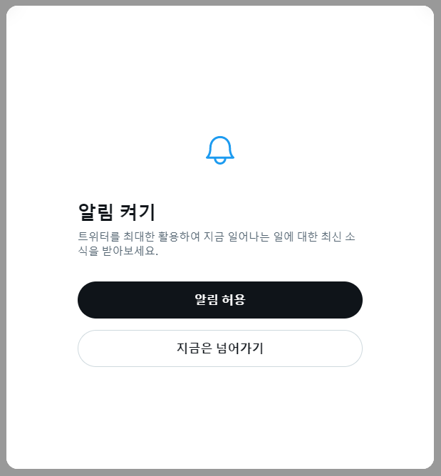 사용자 아이디를 결정한 다음 "알림 켜기" 라는 화면이 보입니다. 알림 허용을 선택해서 최신 소식을 받거나 해야되는데 저는 일단 "지금은 넘어가기"를 눌러서