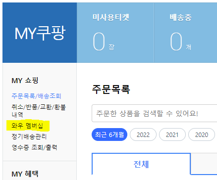 MY쿠팡 화면에서 처음 보이는 메뉴 화면은 주문목록이지만 좌측에 보이는 MY 쇼핑 메뉴 그룹 안에서 '와우 멤버십'을 쉽게 찾으실 수 있습니다.