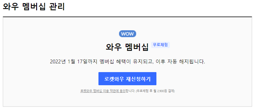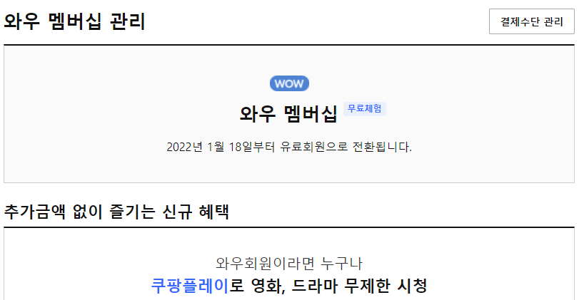 와우 멤버십 메뉴를 클릭하니 와우 멤버십 관리 화면을 보실 수 있습니다. 여기서 유료회원으로 전환되는 일자를 확인하실 수 있는데요.