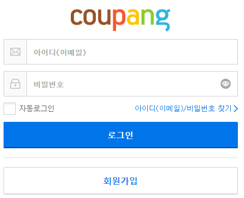 쿠팡 홈페이지 우측 상단의 로그인을 클릭해서 들어가세요. 아이디 비밀번호를 입력해서 로그인하시면 됩니다.