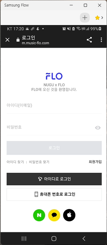 플로 로그인 화면은 다음과 같이 아이디(이메일) 로그인이나 휴대폰 번호 또는 네이버, 카카오톡, 애플과 같은 간편로그인도 가능합니다.