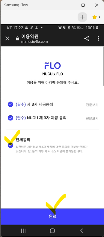 FLO 플로 로그인을 누르면 먼저 이용약관 화면에서 플로 약관에 대한 동의가 필요합니다. 모두 체크해서 선택하거나 전체 약관을 읽고 동의합니다. 를 선택하여 다음을 눌러주세요.