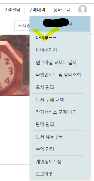 부크크 홈페이지의 우측 상단에 보이는 프로필 이미지에 마우스를 가져가면 마이 부크크, 마이페이지 등 여러 메뉴들이 펼쳐지는데요. 여기서 마이부크크 메뉴를 클릭하세요.