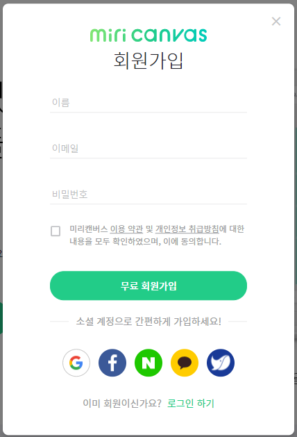 미리캔버스 회원가입은 이름, 이메일과 비밀번호로 간단히 무료 회원가입이 가능하지만 귀찮으신 분들은 카카오톡 같은 SNS 간편 회원가입을 이용해 보시기 바랍니다. 저는 카카오톡을 이용해서 가입해보았습니다.