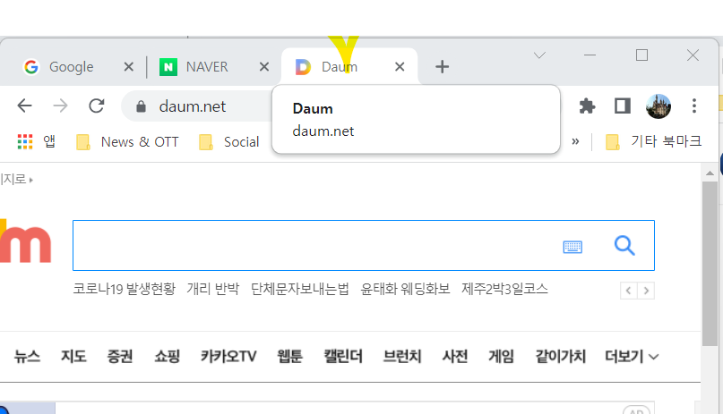 - 창 1개에 3개의 탭 사용중 예시 : 구글, 네이버, 다음 (아래 사진 참조)