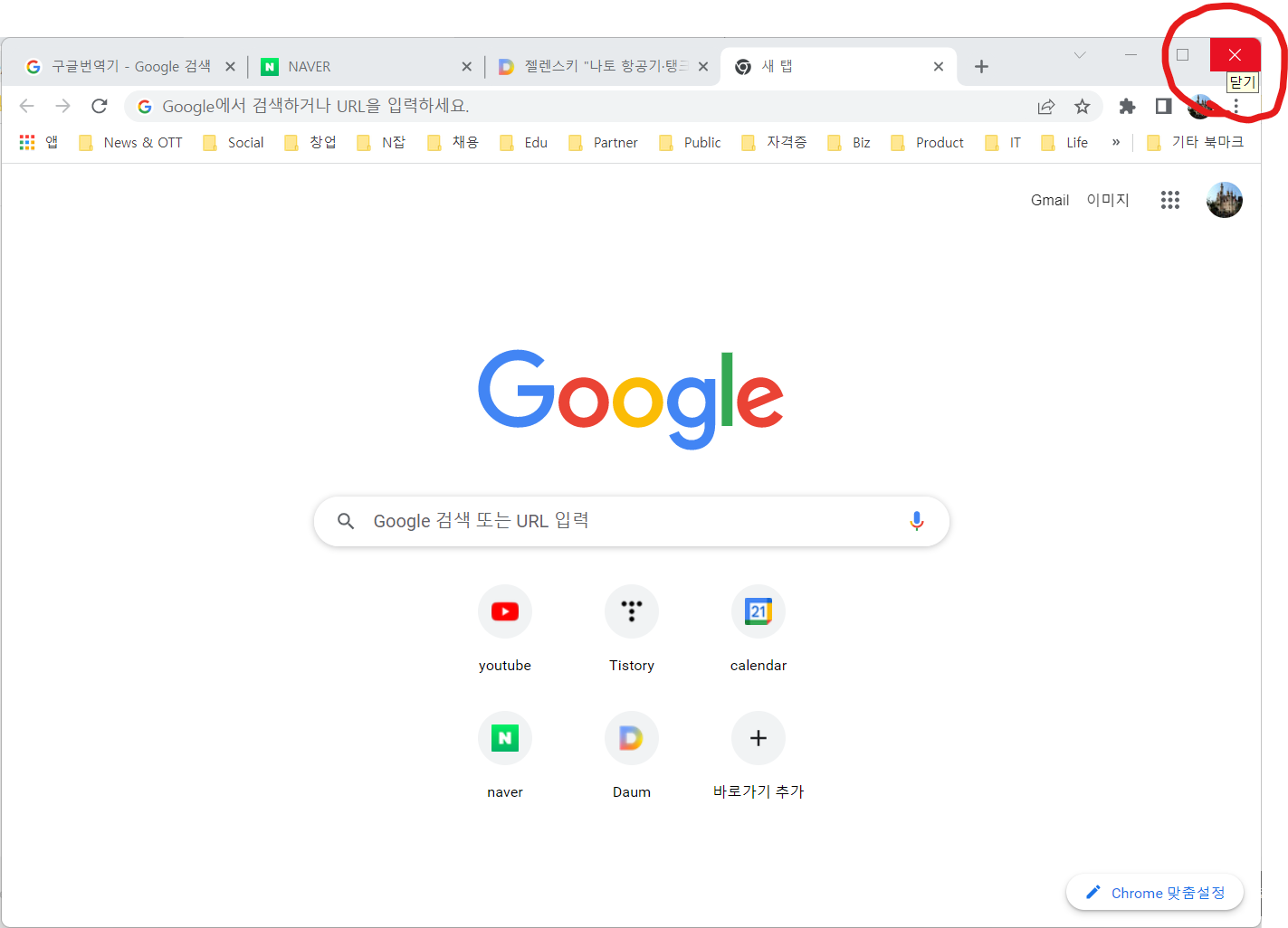 먼저 브라우저의 탭을 하나 닫습니다. 닫는 것은 탭의 우측 상단에 X처럼 생긴 아이콘을 클릭하면 됩니다.