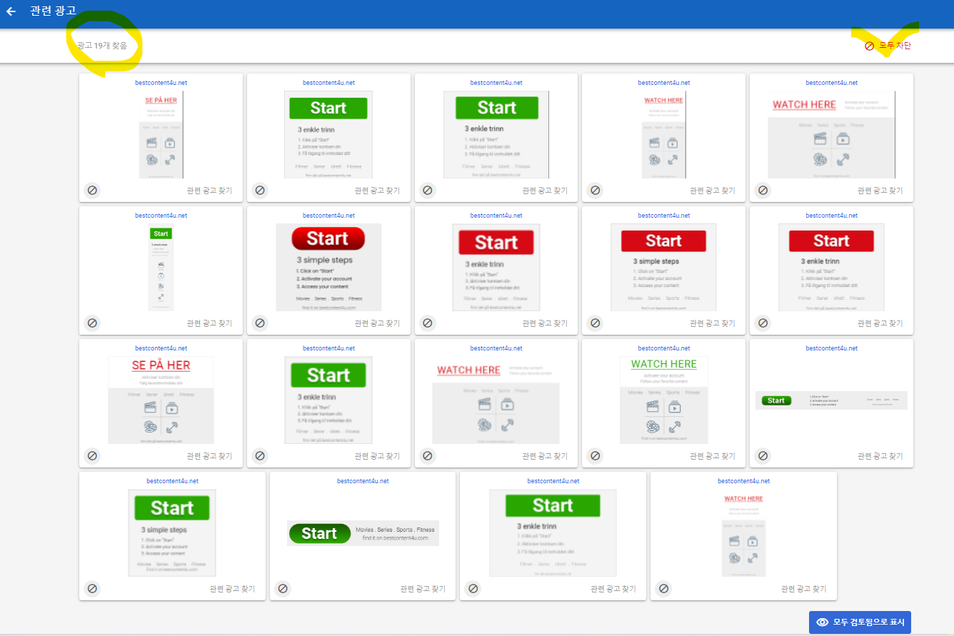 방금 해당 광고주 계정을 차단했지만 좀 전에 찾은 광고 19개는 동시에 같이 차단되지는 않았습니다. 따라서 '모두 차단'을 통해 바로 차단 조치를 하고 작업을 종료하시면 좋을 것 같습니다.