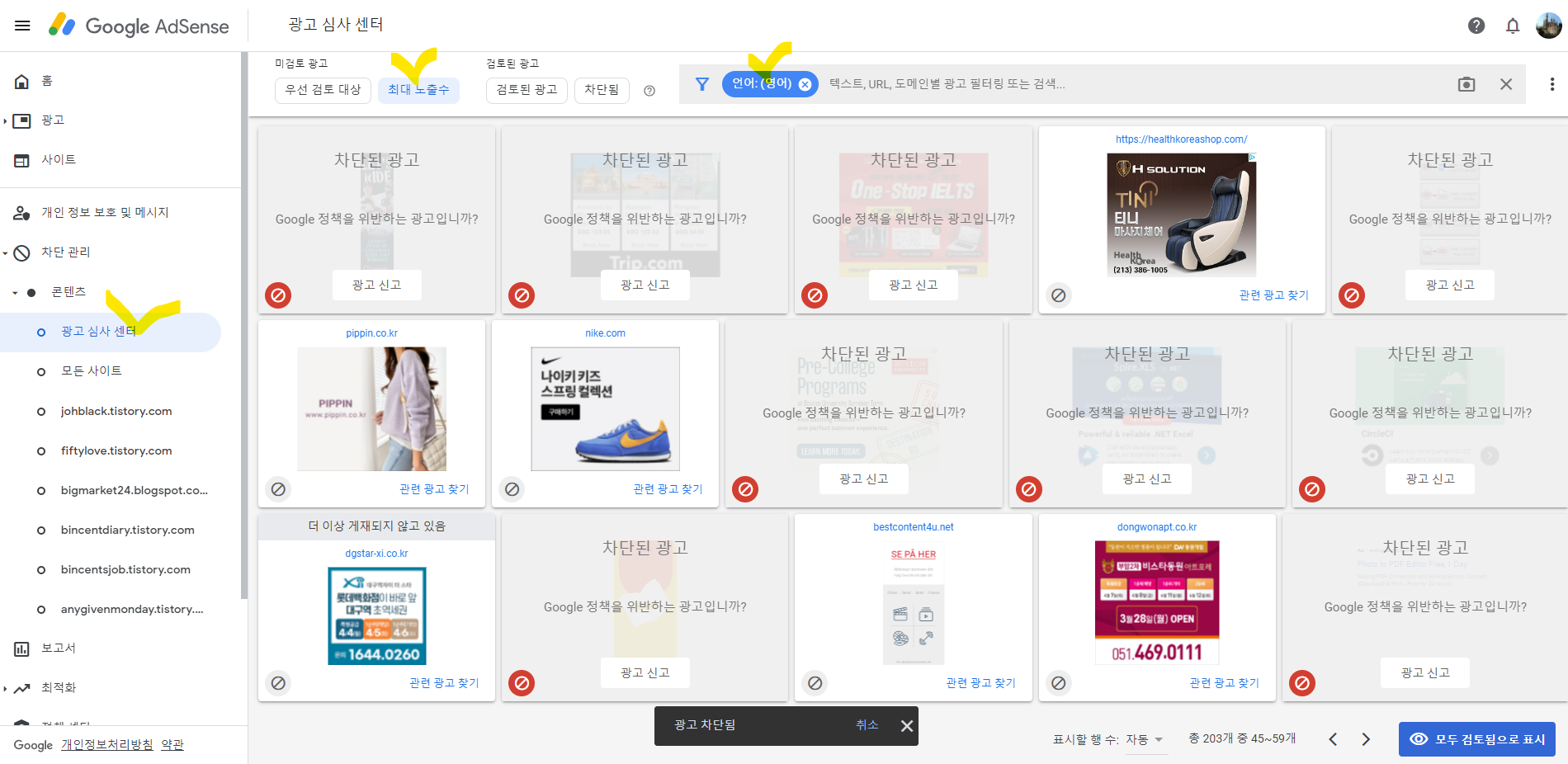 구글 애드센스 홈페이지에 접속하신 후 좌측 차단 관리 메뉴에서 콘텐츠 하위에 광고 심사 센터를 눌러주세요. 광고를 조회할 검색조건 중에서 '최대 노출수' 그리고 필터를 '언어:(영어)'로 걸어보겠습니다.