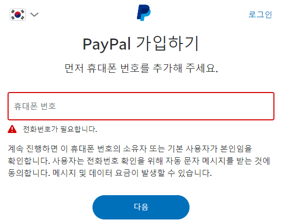 - 페이팔 가입하기 화면 : 휴대폰 인증