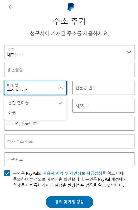 - ID유형 : 운전면허증 또는 여권 중 택일