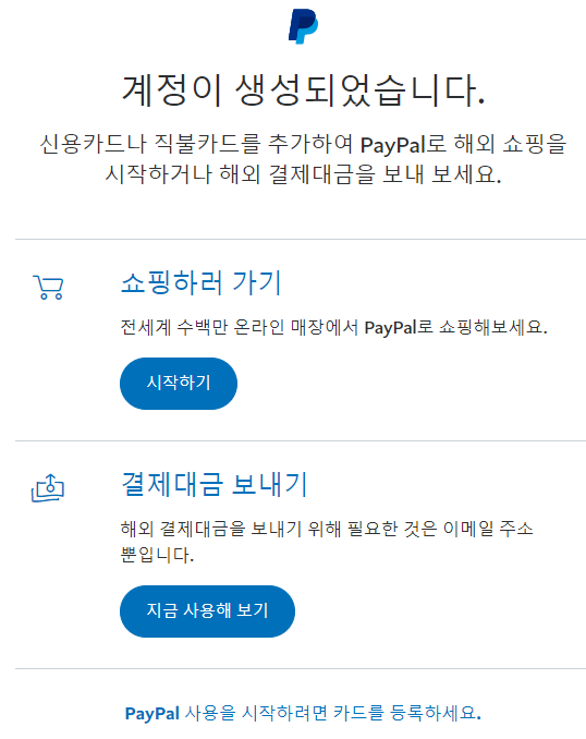 페이팔 계정 생성이 완료된 후 하단에 페이팔 사용을 시작하려면 카드를 등록하세요 라는 링크가 있는데요. 바로 하셔도 되지만 저는 조금 더 확인을 할 것들이 있어 바로 하지는 않겠습니다.