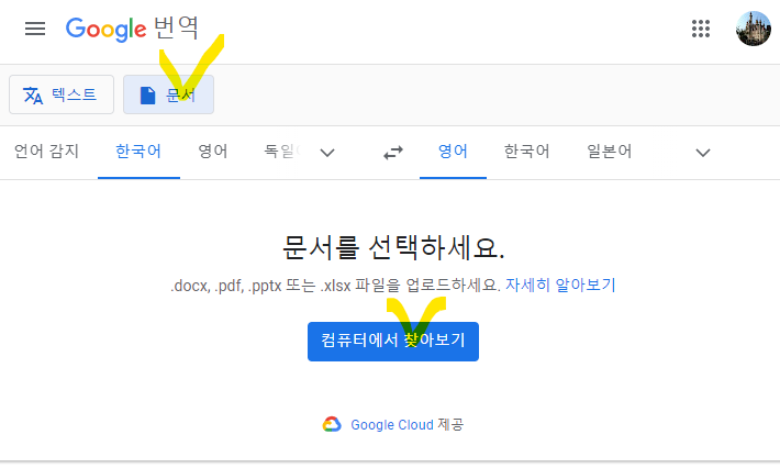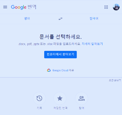 구글 번역 문서 기능에서는 번역할 언어의 선택과 해당 문서를 컴퓨터에서 찾아 업로드하는 과정이 필요합니다.